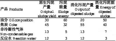 該工藝對原污泥及消化后的污泥均可產生能量,但能量產生效率較大的還是原生污泥。表2是主要生成的產品以及能量產率。通過該裝置后的產物有較好的商業價值。主要產生3種可以加以利用的產品。合成油:干燥1t污泥生成200~300L油。熱值約為35GJ/L,用于發電。惰性灰分:穩定性很高,主要用于多種建筑產品,如鋪路的磚塊。燃燒熱:可通過燃燒焦炭、非冷凝性氣體、以及反應水得到,其可除去干燥污泥的外界能量。