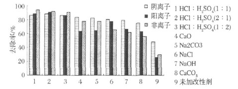 選1mol/LVHCl∶VH2SO4(1∶1),VHCl∶VH2SO4 (2∶1),VHCl∶VH2SO4(1∶2),Na2CO3,NaOH,NaCl 及飽和CaCO3、CaO等溶液對粉煤灰進行改性, 分別取上述改性后的粉煤灰及未改性的粉煤灰各一份,加入陰離子、陽離子、非離子表面活性劑模擬廢水,進行對比實驗,考察廢水中LAS、CT- MAB、OP-10的去除效果,實驗結果見圖1.