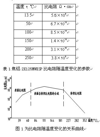 工業粉塵大多是無機化合物或金屬氧化物,它們的電絕緣性能比較好,比電阻一般都有比較高。通常情況下,煙氣溫度高,粘附在粉塵表面的水分了愈少,粉塵的比電阻愈高,一般可達1011歐姆·厘米。但是,當溫度正如超過一定限度時,由于粉塵本身分子熱運動的加強,物質中自由離子的自由電子的數目增加,物質的導電性能增大,表現為本身體積電阻的降低,在此之后,粉塵的比電阻將隨溫度的升高而降低。如圖1。表1為焦鋁2X125MW機組的比電阻隨溫度變化的參數表。