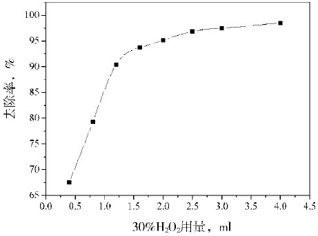 過量的H2O2 會消耗OH,同時H2O2 的用量過高也會增加芬頓試劑處理污水費用,因此討論 H2O2 加入量很有必要。對于100ml水樣,在保持 Fe ( II)溶液用量為2.5ml (20mmol/L) ,其它實驗條件不變,改變H2O2 用量,探討H2O2 用量對苯酚降解效果的影響,試驗結果見圖2。由圖2可知,隨著 H2O2 用量的增加,苯酚的去除率不斷增加,當H2O2 溶液用量從0.4ml增加到2.5ml時,苯酚的降解效果明顯提高,繼續增大H2O2 溶液用量,苯酚去除率增加緩慢。分析認為過量的H2O2 會與OH 的反應,使部分H2O2 發生無效分解,故去除率不再明顯增加。因此對于100ml水樣, 30%H2O2 取2.5ml就已足夠,對應濃度為0.3mol。