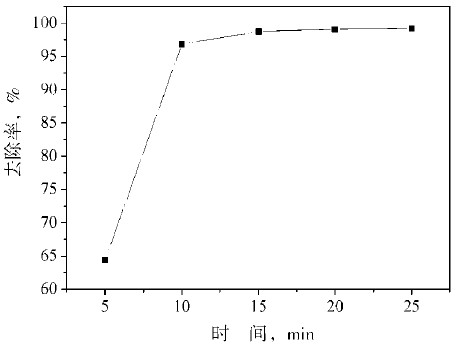 保持苯酚溶液pH值不變, 100ml水樣中,在H2O2 投加量和Fe ( II)溶液投加量均為2.5ml條件下,改變反應時間,探討反應時間變化對苯酚的去除效果,實驗結果見圖4。由圖可知,反應時間在5~10min時苯酚去除效果上升速度最大,而在10min以后去除率不再明顯增加,因此反應時間為10min即可。
