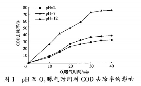 (1) 臭氧氧化法影響因素。pH及臭氧曝氣時間與COD去除率的關系如圖1所示 。