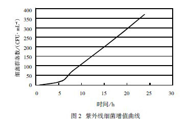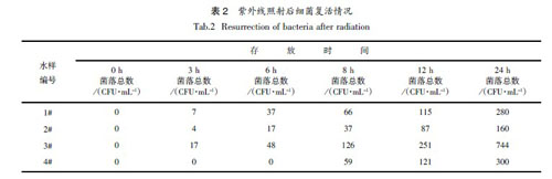 為了研究紫外線消毒的持續性,我們進行了紫外線照射后細菌復活試驗。試驗分為四組平行試驗,一天取一組樣,每組都是經過20 W的紫外線燈管照射(照射時間2.89 s,劑量2 225 μW.s /cm2)后取樣放在化驗室中培養檢測。其復活情況見表2。