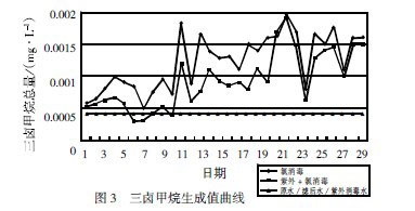 由于三鹵甲烷具有三致性,對人類的健康十分有害,而且也是現行氯消毒工藝的主要副產物,為此,對三鹵甲烷在各處理工藝進出水中的變化結果進行了取樣分析,各工藝流程源水和消毒出水中三鹵甲烷的檢測數據見圖3 和表3。