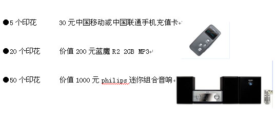 您只需要集齊5個以上的印花,并郵寄到北京市建國門外大街22號塞特大廈506室市場部(郵編100004),即可參與兌獎活動。