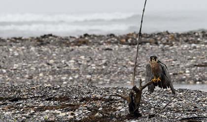 ![]() 5月3日,美國Chandeleur Island,一只游隼落在枯死的樹杈上。 |
