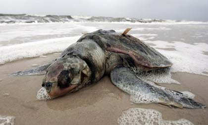 ![]() 5月2日,美國Pass Christian,海灘上一只死去的海龜。 |