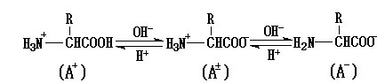 所有的氨基酸都同時含有羧基和氨基,是一種兩性物質。在溶液中的帶電狀態,隨著溶液的pH值而改變。帶有一氨基和一羧基的α-氨基酸隨pH值的離子形態變化如下: