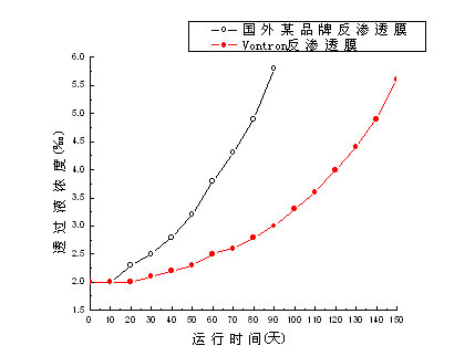 從圖2可以看出,Vontron反滲透膜元件與國外某品牌反滲透膜元件相比,對L-半胱氨酸脫除率的衰減明顯緩慢,膜元件的使用壽命更長。