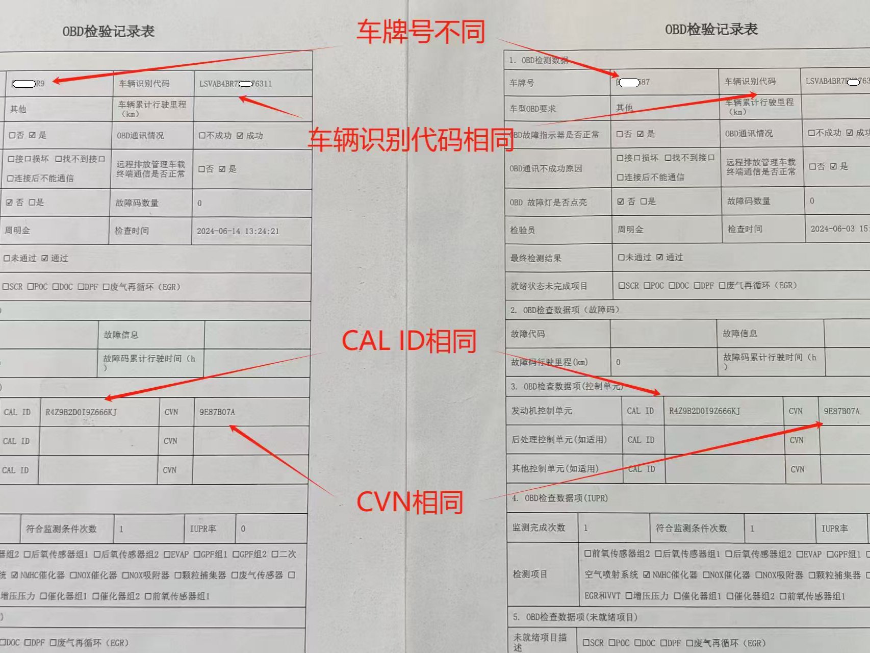 近日,福建省廈門市生態環境保護綜合執法支隊執法人員在開展守護藍天百日攻堅專項行動中,突擊檢查了位于廈門市海滄區的一家機動車排氣檢測機構。執法人員通過福建省機動車污染防治監管系統調閱該公司檢測資料發現,涉及閩DF**87、閩DH**59等5輛車OBD檢驗記錄表中車牌號不同,但車輛識別代碼、發動機控制單元CAL ID、CVN碼都是相同的。面對執法人員的詢問,這家檢測機構負責人解釋,數據是自動上傳的,不清楚怎么會出現數據相同的情況。執法人員初步判斷,這家檢測機構涉嫌違法。