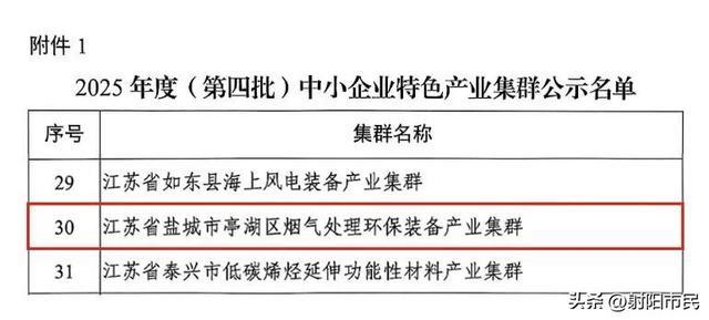 【谷騰環保網訊】近日,工業和信息化部中小企業局發布2025年度(第四批)中小企業特色產業集群公示名單,江蘇省鹽城市亭湖區煙氣處理環保裝備產業集群成功入選。據公示名單顯示,全國共公示100個產業集群,其中江蘇省占6席。