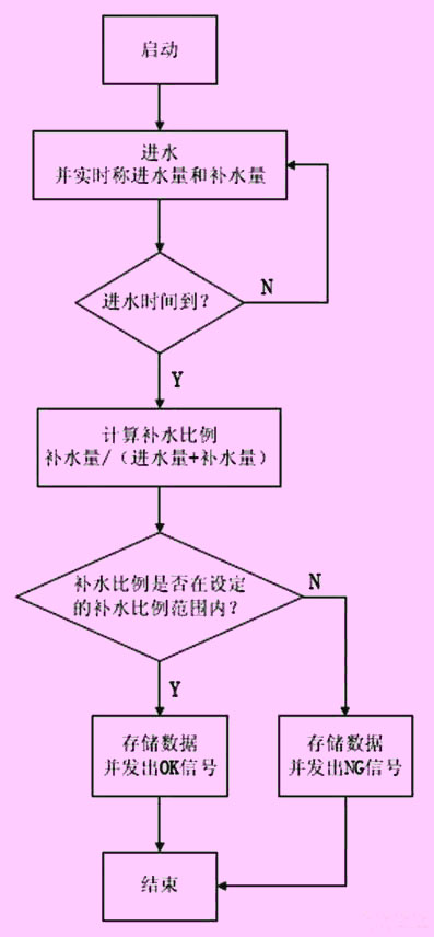 手動將進水閥裝在工裝上→插上補水管并將補水管的另一端插到補水水箱的工裝內→按“啟動”按鈕→機臺自動對電子稱清零→打開球閥進行進水→設定的進水時間到,關閉球閥停止進水→電腦自動記錄進水量(a)和補水量(b),并計算出補水比例(b/(a+b)),然后將數據存儲以備打印或查詢→兩個水箱的排水閥打開進行排水→完成。