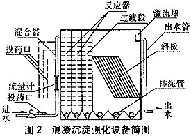 原混凝工藝未設置旋流混合設備,在工程改造中增加了混合裝置,保證了所投藥劑和廢水的充分混合,但在進入中心筒后水的流速僅為0.006m/s,不能有效地保證礬花的碰撞(即在中心筒內只是形成礬花,是一種藥劑作用下的自發狀態,此時礬花僅隨水流穩步下移,對水中的懸浮態顆粒和破乳油的吸附只是停留在低剪切運動水平,小礬花也很難長大),顯然達不到工藝要求。