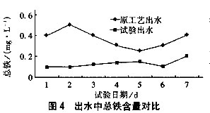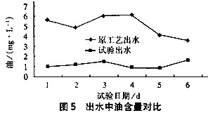 由圖3~5可明顯看出,強化工藝出水的各項指標較廢水處理站原工藝出水好,其懸浮雜質、油、總鐵的去除率分別可達到56%、98%、99%,而且由于總鐵大幅度減少,使得整個處理系統的出水在注水回用的過程中保持穩定,防止了二次污染的發生。