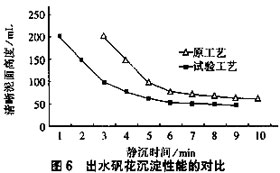 試驗中對混凝強化前后水體中礬花的沉淀性能進行了對比。前者取自水廠投藥后進入沉降罐前的原水,后者是經試驗設備反應4min的混合水,分別置于兩個250mL的量筒,靜沉時間和清晰泥面高度的關系如圖6所示。