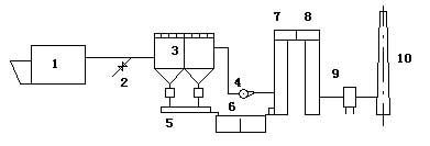 1鍋爐 2冷風閥 3低壓脈沖袋式除塵器 4風機 5水力沖灰器 6加藥、曝氣水池 7脫硫主塔 8脫硫副塔 9煙氣加熱器 10煙囪