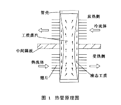 1.1 熱管煙氣換熱器的工作原理熱管換熱器是一種利用高溫流體余熱加熱低溫流體的換熱設備。換熱器中的熱管一般由管殼和內部工作液體(工質)組成。鋼制、密閉管殼內抽成真空, 工質是經特殊處理的液體,如圖1所示。熱管受熱側吸收高溫流體熱量,通過熱管壁傳給管內工質,工質吸熱后沸騰和蒸發,轉變為蒸汽。蒸汽在壓差的作用下上升至放熱側,受管外低溫流體的冷卻,蒸汽冷凝并向外放出汽化潛熱,低溫流體獲得熱量,冷凝液靠重力回到受熱側。如此周而復始,高溫流體熱量便傳給低溫流體, 加熱低溫流體。