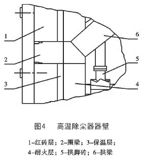 降低工藝氣體經過除塵器的溫降, 主要是通過保溫措施來保證: 在高溫煙氣除塵器中, 器壁采用了燃燒爐的爐墻結構( 如圖4) 。器壁由里而外由耐火層、保溫層、紅磚層以及爐架構成。在承重節點采用水泥圈梁和拱形耐火磚( 下文有專門論述) , 這樣的結構能保證整個除塵器的穩定性及其嚴密性,可使溫降控制在最小的范圍內。爐架尺寸根據計算確定。