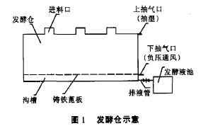 發酵倉為混凝土結構,長10 m,寬3.9 m,高4.1 m,沿發酵倉縱向均布3個800 mm×800 mm的進料口,發酵倉底部縱向設有通風和排水合用的帶坡度(1:100)的溝槽,溝槽寬度為0.9 m,溝槽上放置鑄鐵蓖板,作為空氣和垃圾滲瀝水行流之用。在易腐有機物進倉過程中根據物料的含水率間斷噴灑發酵液,發酵過程中所產生的滲瀝水回流到滲瀝液池,循環利用。