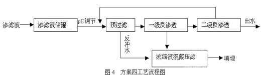 納濾系統采用特殊納濾膜和工藝設計,可使鹽隨凈化水排出,不會出現鹽富積現象,納濾凈化水回收率可達到85。納濾濃縮液量3.7m3/h,為節省投資及運行費用可將濃縮液回灌至填埋場處置。
