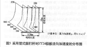 采用管式振打桿時ZT極板法向加速度的分布圖的ZT24型極板,振打錘重量為6.1kg,電場長度為5.76m,振打桿為鋼管式振打桿,從圖5中可以看出,極板右排上方的加速度最小,但仍有 250×9.81m/s2,這一數值對于實現良好清灰已經足夠。2.3收塵極板懸吊方式的改進收塵極板原來采用雙點吊掛方式,但在實際應用中發現,由于加工和安裝的誤差及ZT24型極板的相互扣接的結構特點,很容易造成事實上的單點受力,容易使極板排在工作中產生偏移或極板間產生內應力,甚至造成振打后極板不能復位,影響了電場內的放電效果和振打力的傳遞。因此將極板的懸吊采用整體掛板,單點中心吊掛,這樣不僅可以省去1套掛板,便于安裝,而且可使極板振打時移動更為靈活,有利于振打力的傳遞及振打加速度在極板上的均勻分布,提高振打清灰的效果。