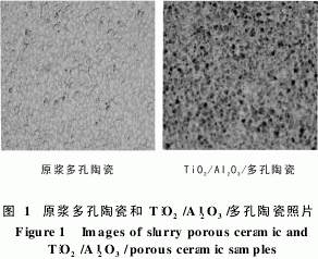 2.1 工藝條件對多孔陶瓷載體制備的影響 原漿多孔陶瓷和TiO2/Al2O3/多孔陶瓷照片如 圖1所示。