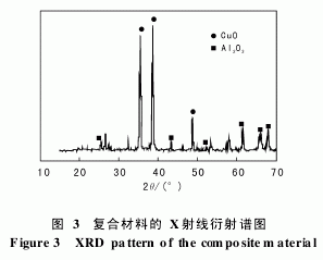 試驗表明,焙燒溫度從600℃上升到750℃, NO轉化率逐步提高。可見提高焙燒溫度促進了催 化劑對NO的催化還原活性。這是由于高溫有利于活性組分Cu在催化劑表面的遷移和擴散,使得活 性組分在催化劑表面分布更均勻[10],另外,高溫焙 燒改變了Cu在催化劑上晶相結構,生成了更有利于催化反應的結構。Cu負載量為多孔陶瓷載體質 量的10%時,Cu/TiO2/Al2O3/多孔陶瓷復合材料的 X射線衍射譜圖如圖3所示。