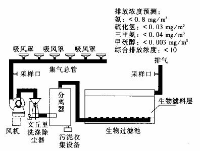 卸料大廳的臭氣和灰塵由設置的吸風罩吸走,通過管道與文丘里洗滌除塵器及分離器聯接,去除塵土后,經管道輸送至后續的生物過濾池進行除臭。空氣流從生物過濾池的底部通向頂部,并從建筑物的頂端排入大氣,其工藝如下圖所示。