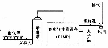 這是一種由韓國LG環境安全研究院研發,上海韓華環保設備技術工程有限公司制作代理的設備。它與文丘里洗滌除塵+生物過濾池沒什么區別,只是改進了原來粗放的方式,用精細的設備代替了生物過濾池,采用先進的微生物膜代替了堆肥、泥煤、樹皮、植物或碎木的混合物作為菌床,采用可控的環境使其運行更為可靠,克服了前述方法體積過大的缺點。設置了加濕裝置,氣體經加濕并除去灰塵后進入生物過濾器,通過附著在過濾介質的表面,經微生物將廢氣中的有害成分分解為CO2、H2O和無害的堿。該方法對去除氨和硫系列的惡臭成分有較好的效果。工藝如下圖所示。