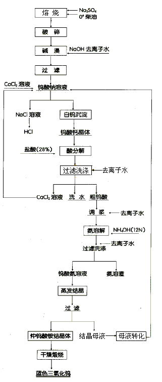 通過凈化得到的CaWO4在鹽酸分解槽(密閉型)中進行分解,得到的鎢酸用去離子水洗滌,脫除鎢酸中的雜質,調漿后的鎢酸加到盛有氨水的攪拌槽中。隨后,鎢酸氨溶液送至壓濾機過濾,凈化的鎢酸銨溶液送去蒸發結晶,蒸發終點通過控制結晶母液的比重來判斷。蒸發結束后,鎢酸氨結晶物用少量的去離子水洗滌,除去游離銨和其他雜質,再將晶體干燥、煅燒制成成品三氧化鎢。反應式為: