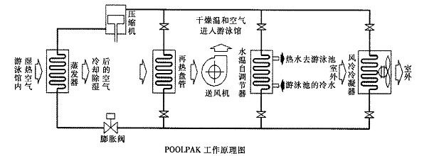 然后低溫氣態制冷劑進入壓縮機,經壓縮低溫低壓的氣態制冷劑變為高溫高壓氣態。在進入壓縮機期間,制冷劑吸收了用于操作壓縮的能量。這種高溫高壓氣態制冷劑流過空氣再加熱盤管 ( 冷凝器) 、池水冷凝器,或流過任選空調冷凝器;可以是風冷式,也可以是水冷式需要對空氣加熱時使用再加熱盤管,高溫的制冷劑與來自蒸發器的較冷的經過除濕的氣流進行能量交換,這可使空氣的溫度升高達到加熱空氣的目的。如果池水需要加熱。高溫的制冷劑就流人池水冷凝器,將能量施加給進入的池水。在給池水加熱的同時,高溫的制冷劑也被冷凝成低溫高壓的液態。如果需要進行空氣冷卻時,制冷劑就繞過再加熱盤管和池水冷凝器流向輔助風冷式冷凝器。讓來自蒸發器的冷空氣給室內游泳館提供 下燥涼爽的空氣環境。熱泵加熱能力= 消耗的電能+ 從環境中吸收的熱量。P O O L P A K熱泵的工作原理圖見下 圖: