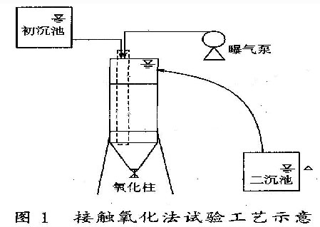 試驗材料包括有機玻璃接觸氧化柱、軟性填料、曝氣器、恒溫室等。EM-1號—購自日本EM技術研究機構南京事務所。試驗用制藥廢水取自徐州某藥業集團污水處理曝氣池進水口,COD。為500-600mg/L,試驗工藝見圖1。