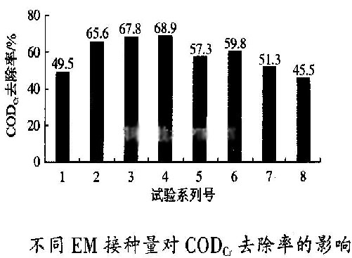 根據圖2可知:試驗系列2號一7號的COD,去除率均較試驗系列對照1號大,其中接種量為5x10-4的氧化柱(試驗系列4號)COD,去除率升幅最大,達19.4%,由此可見加人合適接種量的EM能有效促進廢水中COD,的去除。試驗系列8號的COD。去除率比未加EM的對照試驗系列1號有所下降,主要是受到EM本身COD。值較高(EM原液COD,達40000mg/L)的影響,表觀上顯示出對COD。去除的無效〔2)。