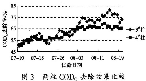 試驗在3#,4#氧化柱中進行,以4#氧化柱作為參照,3#氧化柱加人接種量為1x10-4的EM進行試驗,其他條件與2.1相同,每當3#氧化柱中COD,去除率下降到與4“氧化柱接近時,再加人EM,結果如圖3。