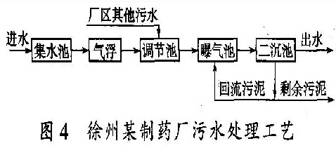 一項廢水處理新技術在實際工程中能否得到推廣應用,必須綜合考慮經濟效益、環境效益與社會效益的統一,既要考慮處理設施的建設、運行與超標排污等費用問題,也要研究污染物排放對環境可能造成的危害等情況,力爭做到既滿足環境保護工作的要,企業又能取得最大經濟效益。徐州某制藥廠污水處理工藝見圖4。