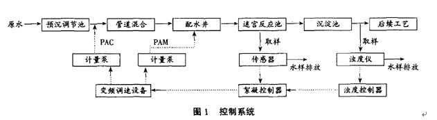 本煤礦礦井水處理廠有新、舊兩套處理系統。新系統處理工藝采用加藥絮凝、反應、沉淀、過濾等常規工藝,舊系統處理工藝與新系統基本相同,不同之處僅在于其反應池為折板反應池。為了提高處理廠自動化水平、保證出水水質、減少藥耗,需要對混凝劑和助凝劑投加進行自動控制,該礦井水處理廠于1997年引進了哈爾濱建筑大學研制開發的透光率脈動絮凝檢測系統,以及由河北省唐山煤礦設計研究院開發研制的自動控制系統,并將本系統應用在新系統中。
