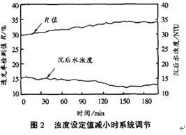 本系統中,由于井下工藝的要求,使得原水流量經常發生改變,對控制系統造成沖擊,而原水水質比較穩定,變化很緩慢,對控制系統不會造成大的沖擊,因此只考察控制系統對原水流量變化的調節能力。原水流量的變化幅度一般為30%-50%,但變化速度較快,經常在十幾分鐘內流量發生改變,因此對控制系統的要求比較高。圖3為在一次流量變化時系統的調節情況。從圖中可以看出,系統對原水流量的變化的調節比較迅速及時,大約15min內就可以將檢測值R調整到原設定值,而這對于沉淀池出水濁度的影響不大,可以滿足處理工藝的要求。