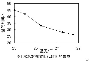 在食物和其他環境條件適宜的條件下,升高溫度可加快搖蚊的生長發育速度,縮短周轉率[3]。溫度與世代時間呈負相關性,搖蚊完成一個世代的時間隨溫度的變化情況如圖1[4]。