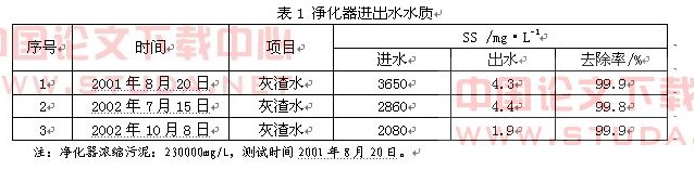 4.1、 1999年10月,南京慧邦科技研究所的第1套用于灰渣水處理的DH高效(旋流)污水凈化器在國華北京熱電分公司正式投運。該廠選用2臺φ2800mm的DH高效污水凈化器用于120m3/h沖灰渣廢水的處理回用。單臺處理能力為60m3/h,最大處理能力80m3/h,處理原水為濃縮機沉淀排出的灰渣水,水質濃度SS 2000~3000mg/L,最大濃度SS 10000mg/L,運行至今狀況良好。經國華北京熱電分公司測試,凈化器進出水水質如表1所示。