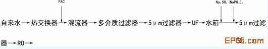 采用UF作RO前的預處理,去除微生物的效果更佳。例如某廠引進新加坡盛康公司的純水站280m3/h預處理工藝為: