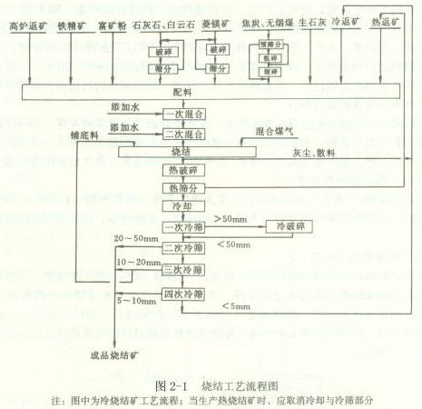 鑒于Fe(OH)3在沉淀和脫水性能方面遠比Fe(OH)2好,為使處理構筑物和設備能力減少,從而采取曝氣或用一氧化氮催化氧化,然后以石灰中和,可提高沉淀效果和出水水質。 礦山酸性廢水的處理離不開中和法,常用的中和劑是石灰石和石灰,因為其他中和劑價格高不宜采用,因此處理后水中的Ca2+往往含量很高或者是飽和的,再利用時應特別注意水質穩定問題,否則引起管道和設備的阻塞,給生產帶來更大損失。 第二節燒結廠廢水處理與回用 燒結的生產過程是把礦粉、燃料和溶劑按一定比例配料,混勻,然后在高溫下點火燃燒,利用其中燃料燃燒時所產生的高溫,使混合料局部熔化,將散料顆粒粘結成塊狀燒結礦,作為煉鐵原料,在燃燒過程中,同時去除硫、砷、鋅、鉛、等有害雜質。燒結礦經冷卻、破碎、篩分而成5~50mm粒狀料送入高爐冶煉。工藝流程示于圖2-1。