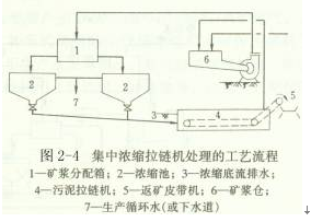 3.集中濃縮拉鏈機處理工藝 此法的特點是處理后的水質可達循環用水的水質要求,通過污泥拉鏈機保證了排泥的連續性。圖2-4為集中濃縮拉鏈機處理工藝的示意圖。濃縮池的溢流水供循環使用。濃縮后的底部污泥排入拉鏈機,在拉鏈機中再沉淀,沉淀的污泥由拉鏈傳送到返礦皮帶上,送往混合配料。其含水率可以達到20%~30%,拉鏈機的溢流水再返回到濃縮池中。