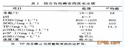 該公司有機磷農藥廢水主要來自氧化樂果、久效磷等產品生產過程。按污染程度可將廢水分為兩部分,一部分為高濃度有機磷農藥廢水,其主要成分為硫磷酯、氯化銨、氯乙酸甲酯等。對該廢水首先采用沉降分離法將絮狀物硫磷酯沉降分離,回收后的粗酯經過精制再利用,分離后水中的硫磷酯經高效萃取塔,用氯乙酸甲酯(萃取劑)強化萃取回收,經過回收預處理后,廢水的COD為2000 mg/L左右。另一部分為其他生產單位排放的廢水,其COD為300~400 mg/L。兩種廢水混合后形成綜合有機磷農藥廢水,水量為2000 m3/d。綜合有機磷農藥廢水水質見表1。