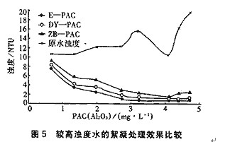 原水濁度為1.0~4.0 NTU時,在同樣的鋁投加量下,E—PAC的水處理效果明顯比其他絮凝劑好,不僅表現在對濁度的去除效率高,而且投加藥量所允許的范圍也大。