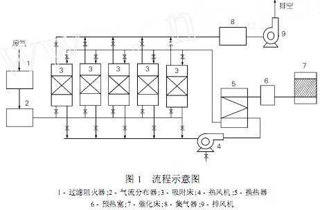通過分析并比較各種處理有機廢氣的技術與工藝 ,人們提出了結合的處理工藝技術 ,此工藝技術適用于大風量、低濃度的苯類、 酮類、醛類、醇類等多種有機廢氣治理。采用活性炭纖維吸附濃縮、熱空氣脫附和催化燃燒三種組合工藝凈化有機廢氣。工藝