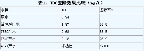 分別取原水、活性炭出水、反滲透ACM1、納濾TS40、納濾TS80三種型號膜出水水樣,進行TOC的測定,結果見表1。