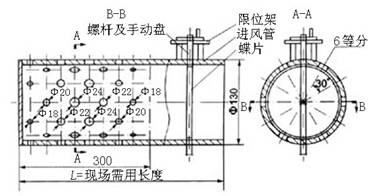二次風調節裝置主要由Φ130mm的鋼管和蝶閥組成,在鋼管上按Φ18mm、Φ20mm、Φ22mm、Φ24mm、Φ24mm、Φ22mm、Φ20mm、Φ18mm的順序排列布置鉆孔,徑向6等分均布,軸向300mm范圍8排均布,目的是將二次風均布在含塵熱氣體之中,中和氣體溫度,避免滌綸濾袋受熱溫度過高。鋼管鉆孔端用鐵板密封,在進風端裝一蝶閥,控制二次風量。二次進風管鉆孔端安裝在旋風除塵器與袋式除塵器之間的進風管道中,水平放置,便于人工調節蝶閥。二次風調節裝置結構見圖3。