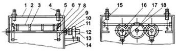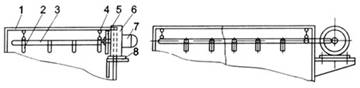 將原搖擺式的清灰機構改造成振打式。方法是:把原濾袋吊架4個活動絞鏈聯接改造成垂直滑動的彈性聯接,減速機偏心盤擺動裝置改造成靠邊輪傳動軸凸輪裝置,由原一側裝配改成中心裝配,并在濾袋吊架4個角各配1只慣性錘和振幅限位可調絲桿。改進前后結構見示意圖5、圖6。