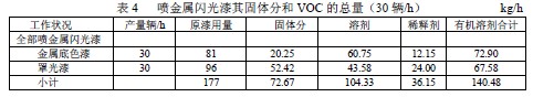 經對上述各種工況進行分析后,以全部噴涂金屬閃光漆每小時所用工作漆中含VOC 的總量最大;且在噴漆室、流平室及烘干室產生的二甲苯、甲苯及非甲烷總烴的廢氣量也最大;噴漆室產生過噴漆霧的固體分(顆粒物為18.17 kg/h,過噴漆霧中的有機溶劑已經單獨計算)也最大,其值見表4、表5。