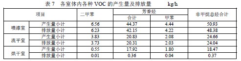 噴金屬底色漆及罩光漆時,噴漆室廢氣及過噴漆霧和一半的流平室廢氣經噴漆室底部水循環系統絮凝處理后,其中二甲苯及芳香烴可吸收 5%(被包裹在漆渣中),酯、酮、醚、醇等類可吸收13%(部分溶解在水中,部分被包裹在漆渣中);過噴漆霧中的油漆固體分與噴漆室底部水充分接觸,其漆霧被加入絮凝劑的水充分吸收形成漆渣,其凈化效率在95%以上,故排放的過噴漆霧很少,且風量很大,故可忽略不計;流平室另一半廢氣與噴漆室廢氣合并成一個排氣塔大風量、低濃度高空排放;烘干室采用直接燃燒法處理,凈化效率達98%以上。經以上處理后,噴漆室、流平室及烘干室每小時各自產生和排放的 VOC 量見表7。